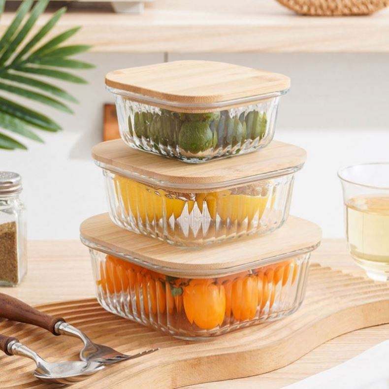 ชามใส่อาหาร/ผลไม้/สลัด แบบหลายชั้น สำหรับใช้ในบ้าน พร้อมฝาปิดไม้ไผ่สูง โปร่งใส