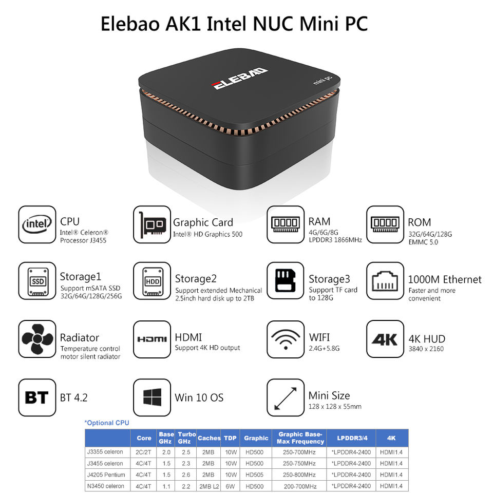Newest AK1 Mini PC Win10 Intel Apollo Lake Celeron J3455 4GB 64GB SSD Dual HD Power on Line Support 2.4G 5G Wi-Fi