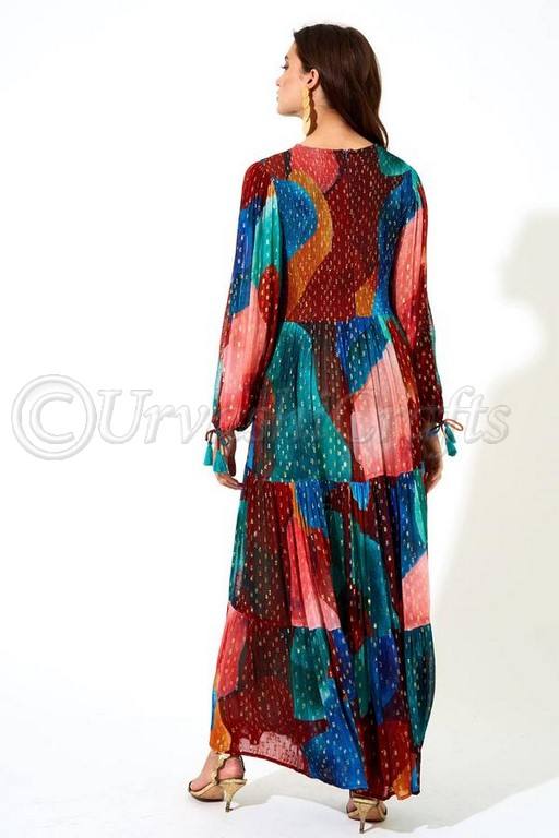 เดรสคอตตอนสีทองระยิบระยับสำหรับผู้หญิง,เดรสแม็กซี่เดรสแขนยาวผูกเชือกเอวสูงพิมพ์ลายทรงสง่าใหม่ล่าสุดสำหรับฤดูร้อน