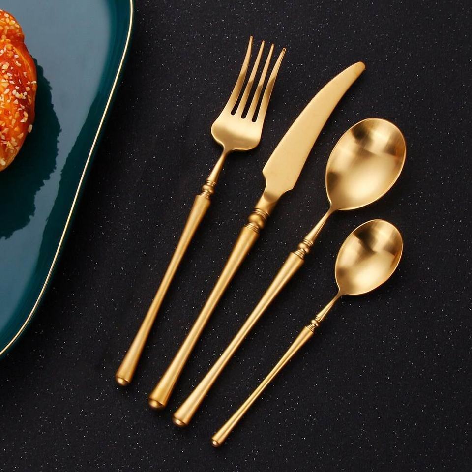 ชุดช้อนส้อมโลหะดีไซน์ใหม่ล่าสุดสำหรับใช้ในบ้าน สีทอง ชุดช้อนส้อมดีไซน์ทันสมัย ช้อนส้อมสแตนเลสแบบมันเงา