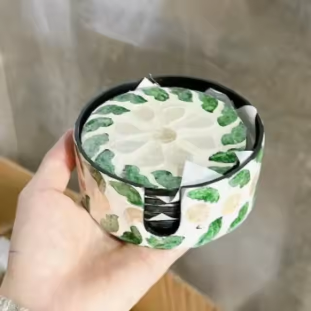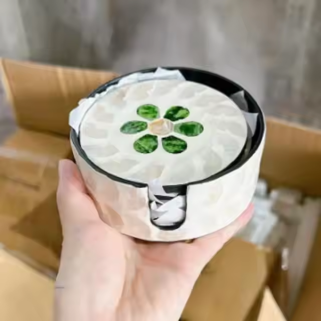 ถาดรองแก้วทรงกลมฝังมุกลายใหม่ล่าสุดพร้อมที่จับสีสันสดใสสำหรับถ้วยน้ำชาทำมือร้านอาหารจาก