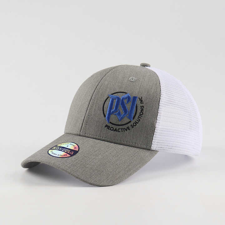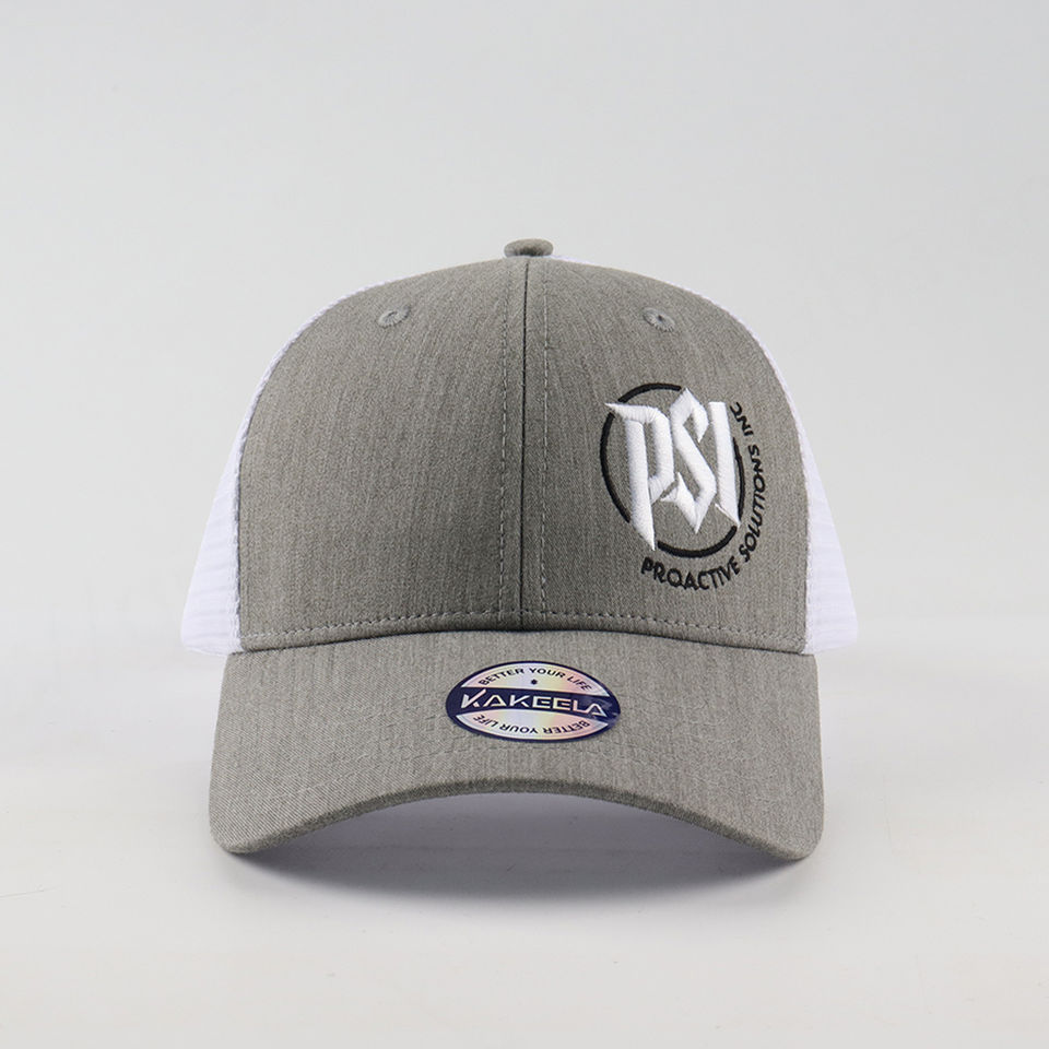 หมวกคนขับรถบรรทุก6แผงทำจากโพลีเอสเตอร์สีเทาเฮเทอร์ผ้าแห้งเร็วด้านหลังปีกโค้งสแนปแบ็กประสิทธิภาพการปิดแฟชั่นปรับได้