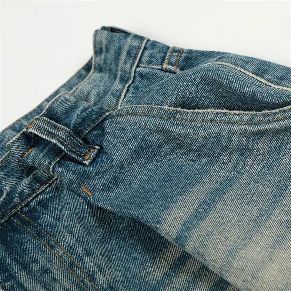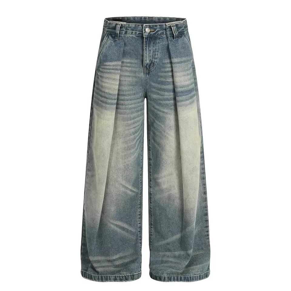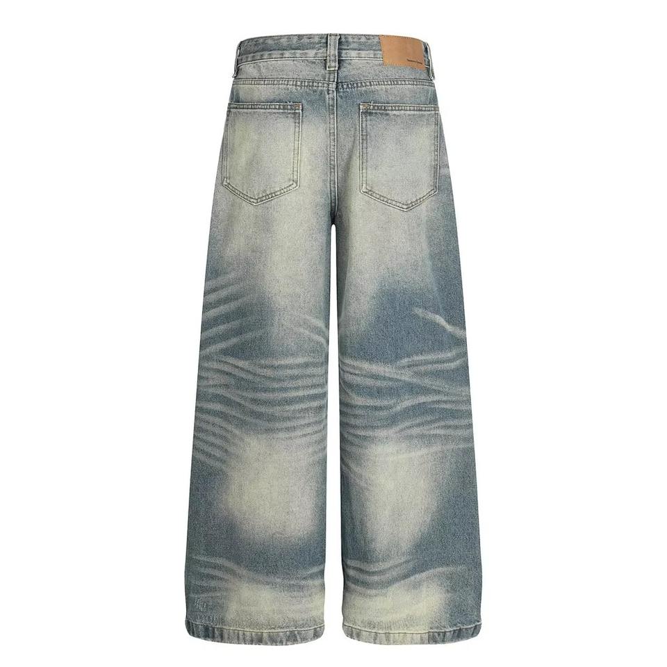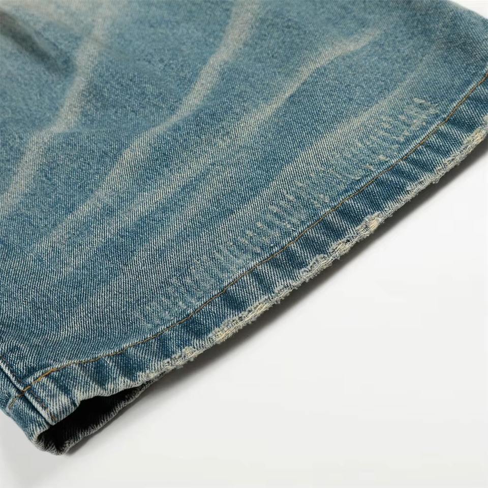 กางเกงยีนส์ทรงตรงผ้าเดนิมฟอกสไตล์ลำลองสำหรับผู้ชายรุ่นใหม่ล่าสุด ฤดูใบไม้ร่วง ผ้าฝ้าย 100% น้ำหนักปานกลาง แห้งเร็ว ทรงขากว้าง