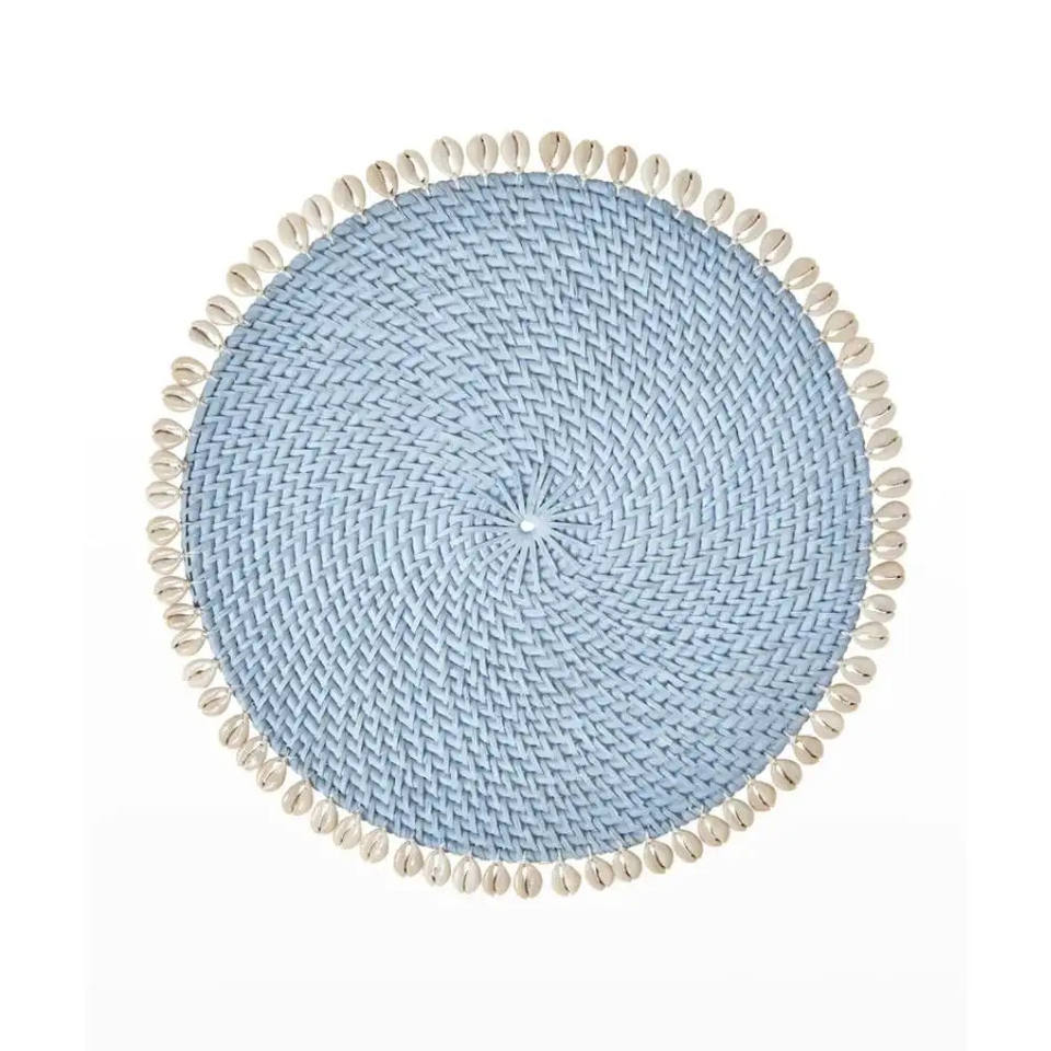 จานหวายธรรมชาติทรงกลมรุ่นใหม่ล่าสุดพร้อมเปลือกหอยตกแต่งสําหรับจัดเก็บในครัว ซับในหม้อหรือแขวนผนังตกแต่ง