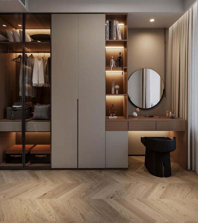 ตู้เสื้อผ้าแบบวอล์กอินแบบพกพาตู้ห้องนอนทำจากไม้พร้อมประตูไม้เนื้อแข็งระบบที่ออกแบบได้ตามต้องการใหม่ล่าสุด