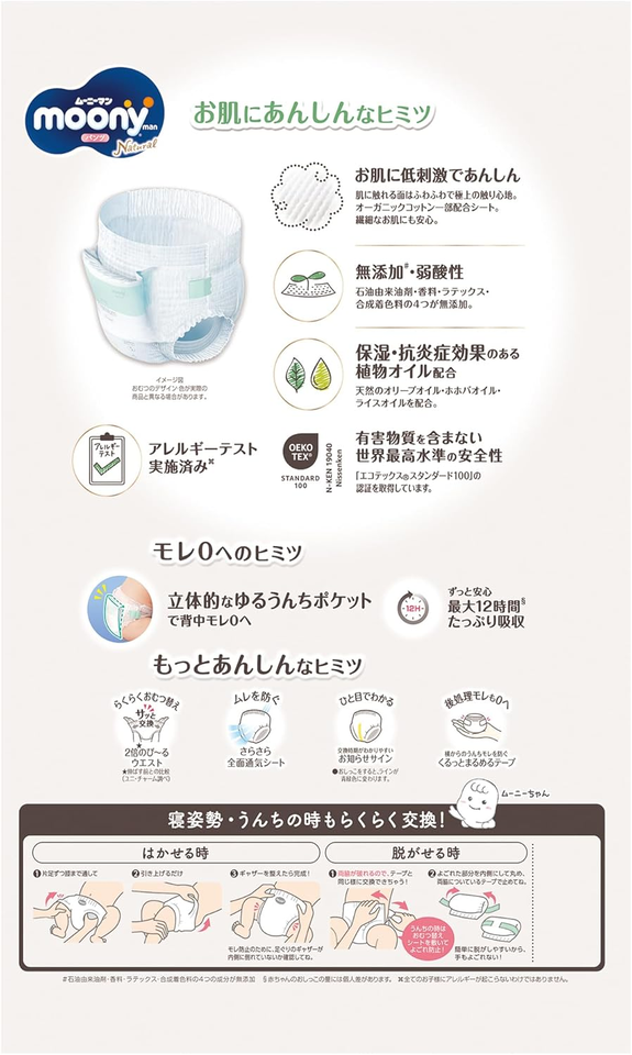 ผ้าอ้อมสำเร็จรูปมูนนี่รุ่นใหม่ล่าสุด ผลิตจากฝ้ายออร์แกนิคธรรมชาติ ลายพิมพ์น่ารัก ขนาด S (4-8 กก.) 50 ชิ้น นุ่มพิเศษ เป็นมิตรต่อสิ่งแวดล้อม ป้องกันการรั่วซึมแบบ 3 มิติ