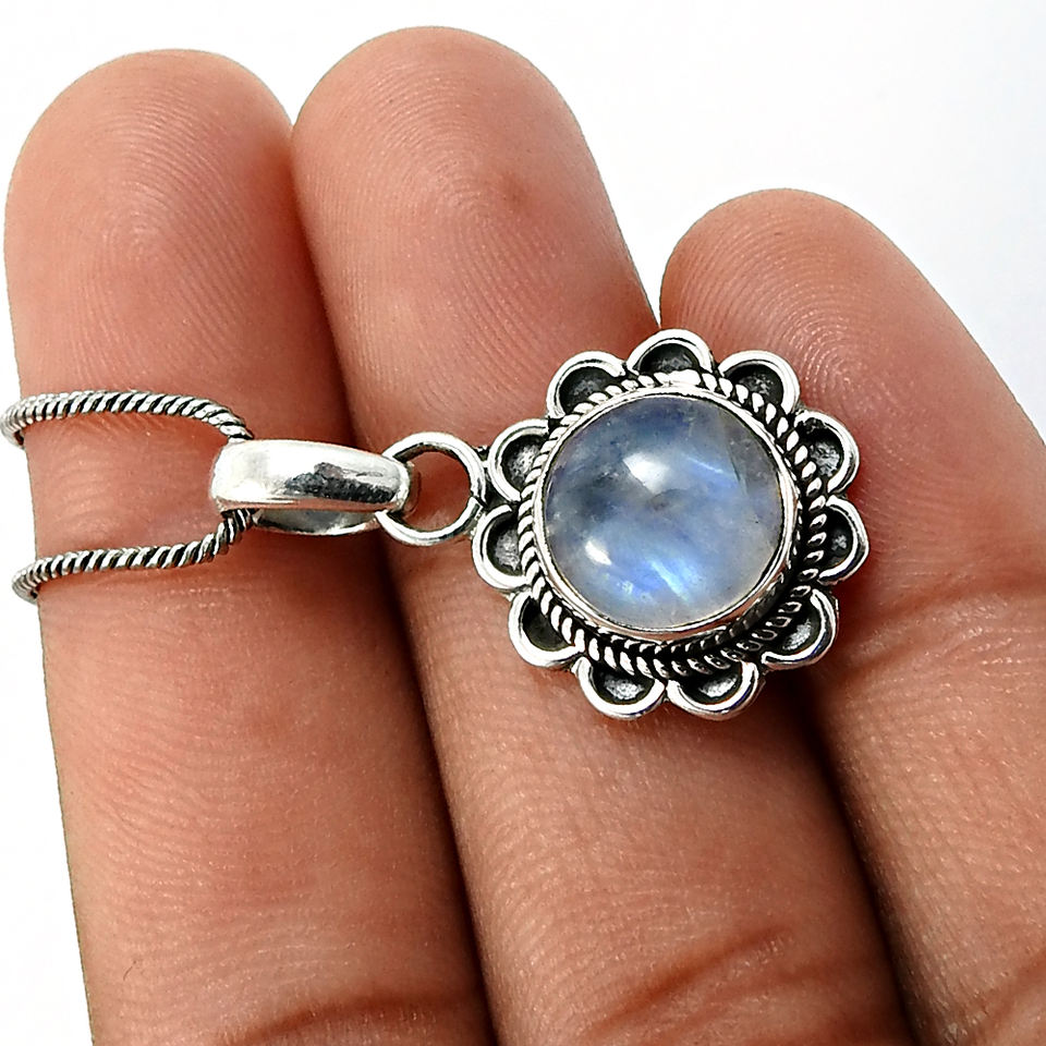 จี้พลอยมูนสโตนสีรุ้งธรรมชาติใหม่ล่าสุดจี้925เงินสเตอร์ลิงจี้ดอกไม้ทรงกลมเครื่องประดับโบฮีเมียนขายส่ง