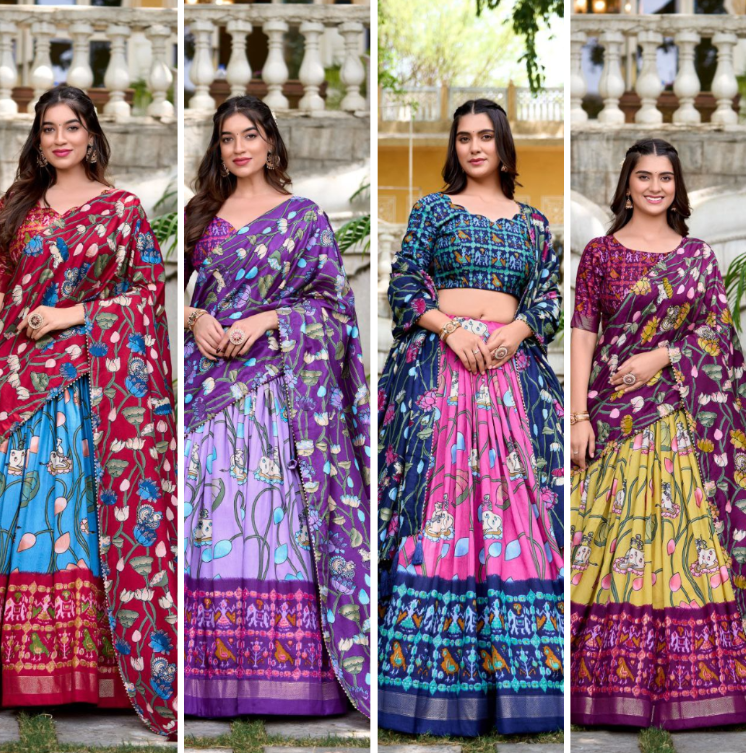 Newly Designed Traditional Tussar Silk Lehenga Patola Print With Zari Weaving Border for Festive Wedding Wear Party Wear Choli