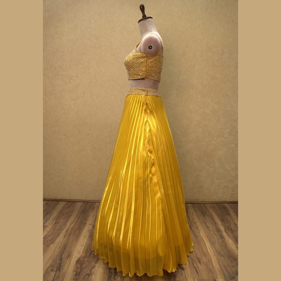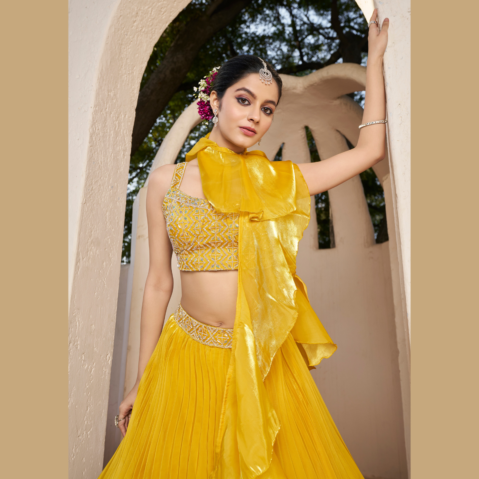 Lehenga สีเหลืองพร้อมกระจกงานปักด้วยมือสำหรับงานฉลองวัฒนธรรมและงานแต่งงานจากอินเดียขายส่ง