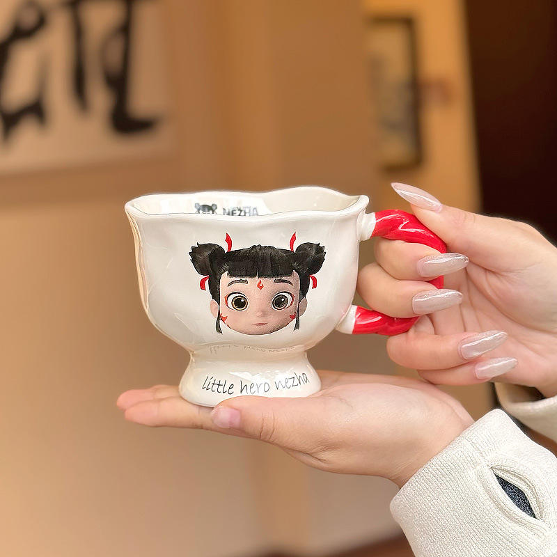 ถ้วยเซรามิกเนจ่าสไตล์การ์ตูนพร้อมที่จับสำหรับใช้ในบ้านสำนักงานถ้วยกาแฟนมชิ้นเดียว