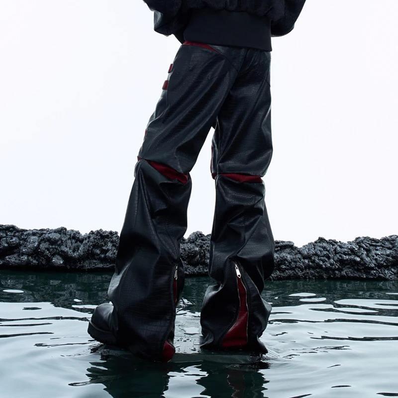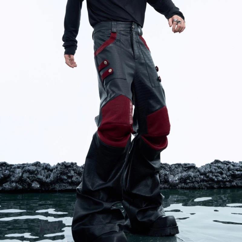 กางเกงลำลองผู้ชายสไตล์แพทช์เวิร์คปี 2024 กางเกงหนัง PU ดีไซน์แบบ Deconstruction ตัดต่อผ้าแคนวาสทรงขากว้างเอวกลาง