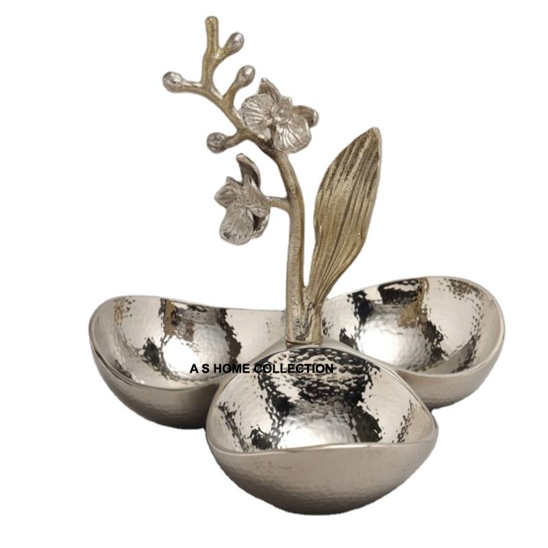 ชามทองเหลืองชุบนิกเกิลออกแบบสามพาร์ทิชันด้วยไม้ทุบดีไซน์ดอกไม้หรูหราชามสลัดและถั่ว