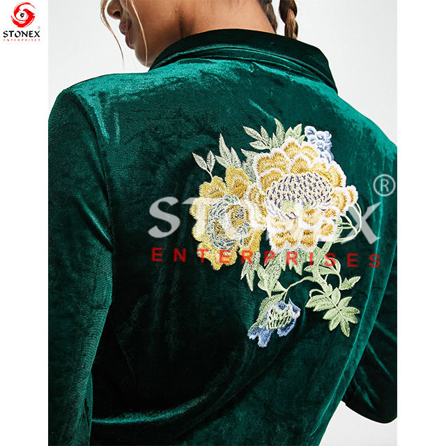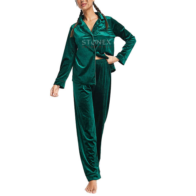 เซ็ตชุดนอนผ้ากำมะหยี่ยาวสำหรับกลางคืนพร้อมลายปักที่ด้านหลังรายละเอียดชุดนอนสีเขียวในป่าชุดกลางคืนล่าสุด