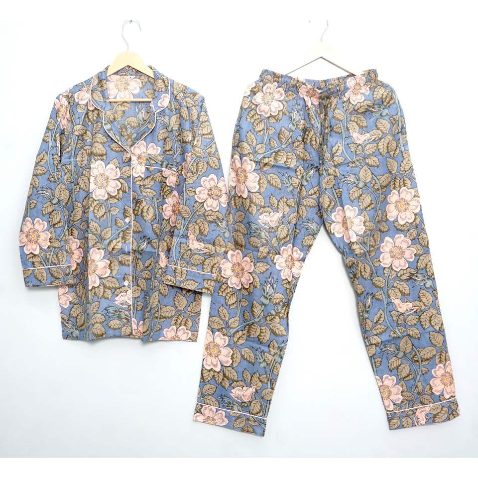 ชุดนอนผ้าฝ้ายแขนยาวสำหรับผู้หญิง ลายดอกไม้พิมพ์ลายด้วยมือ สวมใส่สบายๆ ในฤดูร้อน