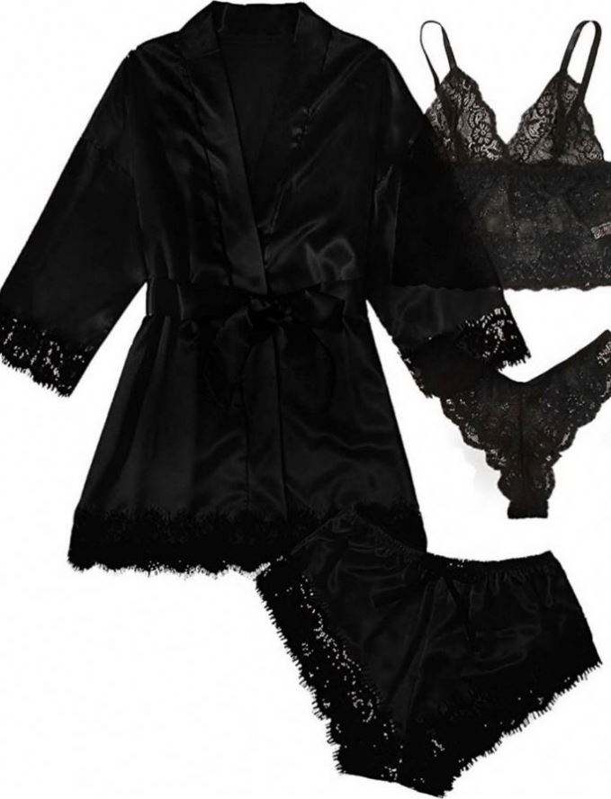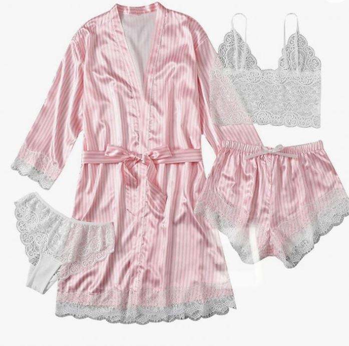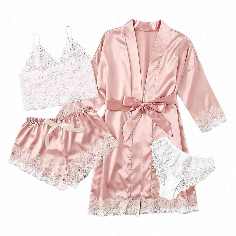 ชุดนอนขายส่ง ชุดนอนสี่ชิ้น ผ้าซาตินระบายอากาศดี ชุดคลุมลูกไม้ ชุดนอนผ้าซาตินไหมเซ็กซี่ ชุดนอนผู้หญิง ชุดนอนเซ็ต