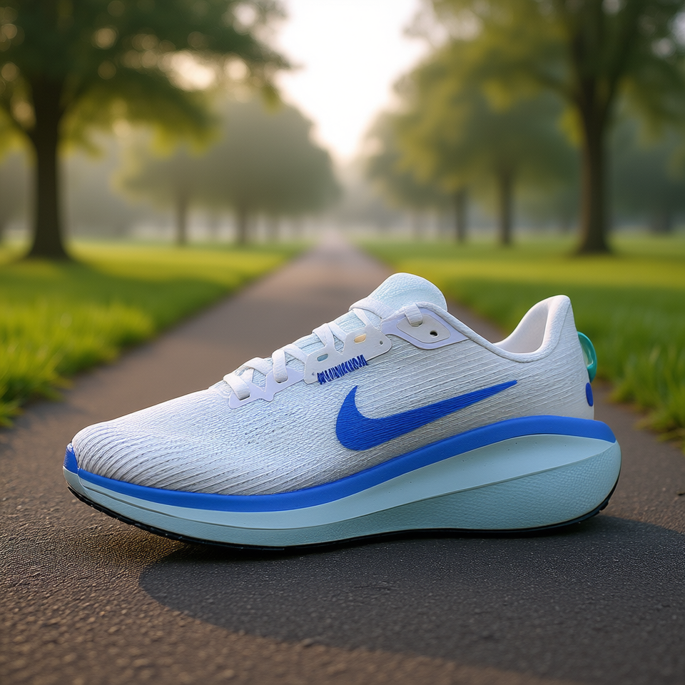 ไนกี้ โวเมโร 17 รองเท้าวิ่งสำหรับทุกเพศสีขาวรอยัล พัลส์ แกลเซียร์ บลูตาข่ายสีน้ำเงินด้านบน พื้นรองเท้า EVA พื้นรองเท้ายางด้านนอกสปริง