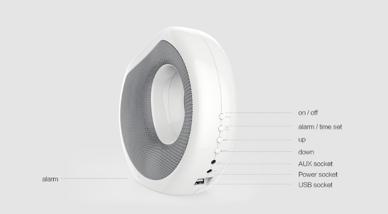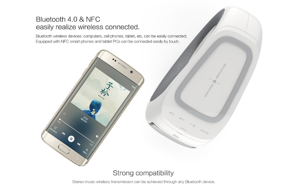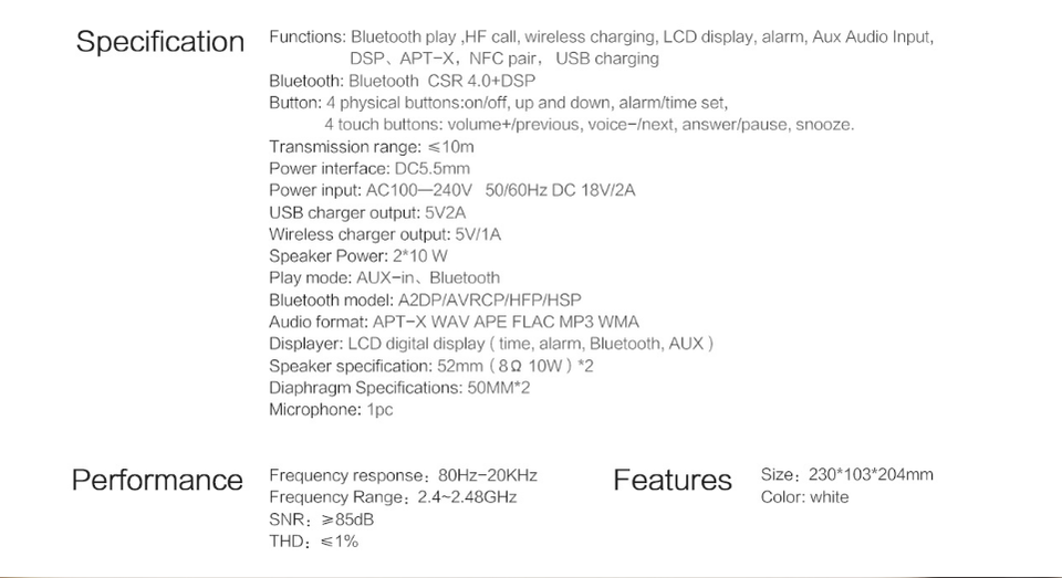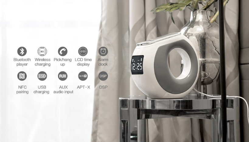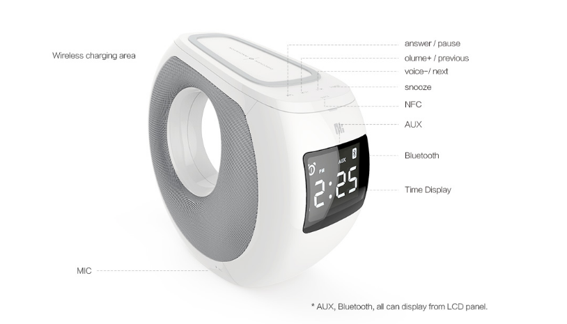 ลำโพง, ที่ชาร์จไร้สาย, ไมค์, นาฬิกาปลุก, AUX-in, NFC, ชาร์จ USB