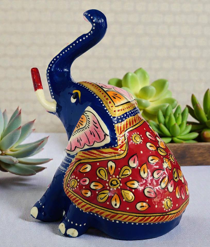 งานฝีมืออลูมิเนียมมีนาคารี รูปปั้นช้างยกงวงทำมือสไตล์อาร์ตเดโค ประดับด้วยงานเคลือบ จากรัฐราชสถาน โดยนิรมลา แฮนดิคราฟท์ส
