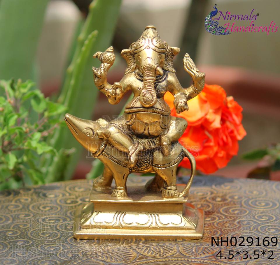 งานฝีมือนิรมลา รูปปั้นพระพิฆเนศทองเหลืองนั่งบนฐานมูชาค พร้อมรูปปั้นหนูวินายากา มูรตี ผลิตในรัฐราชสถาน ทำด้วยมือ