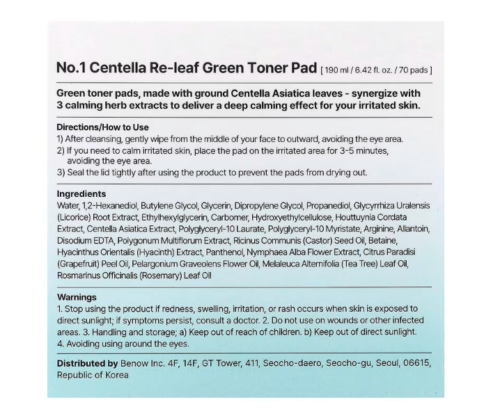 แผ่นโทนเนอร์เซนเทลล่า รีลีฟ กรีน หมายเลข 1 แผ่นโทนเนอร์บำรุงผิวหน้า ช่วยปลอบประโลมผิว ด้วยสารสกัดจากใบบัวบก เหมาะสำหรับผิวแพ้ง่าย