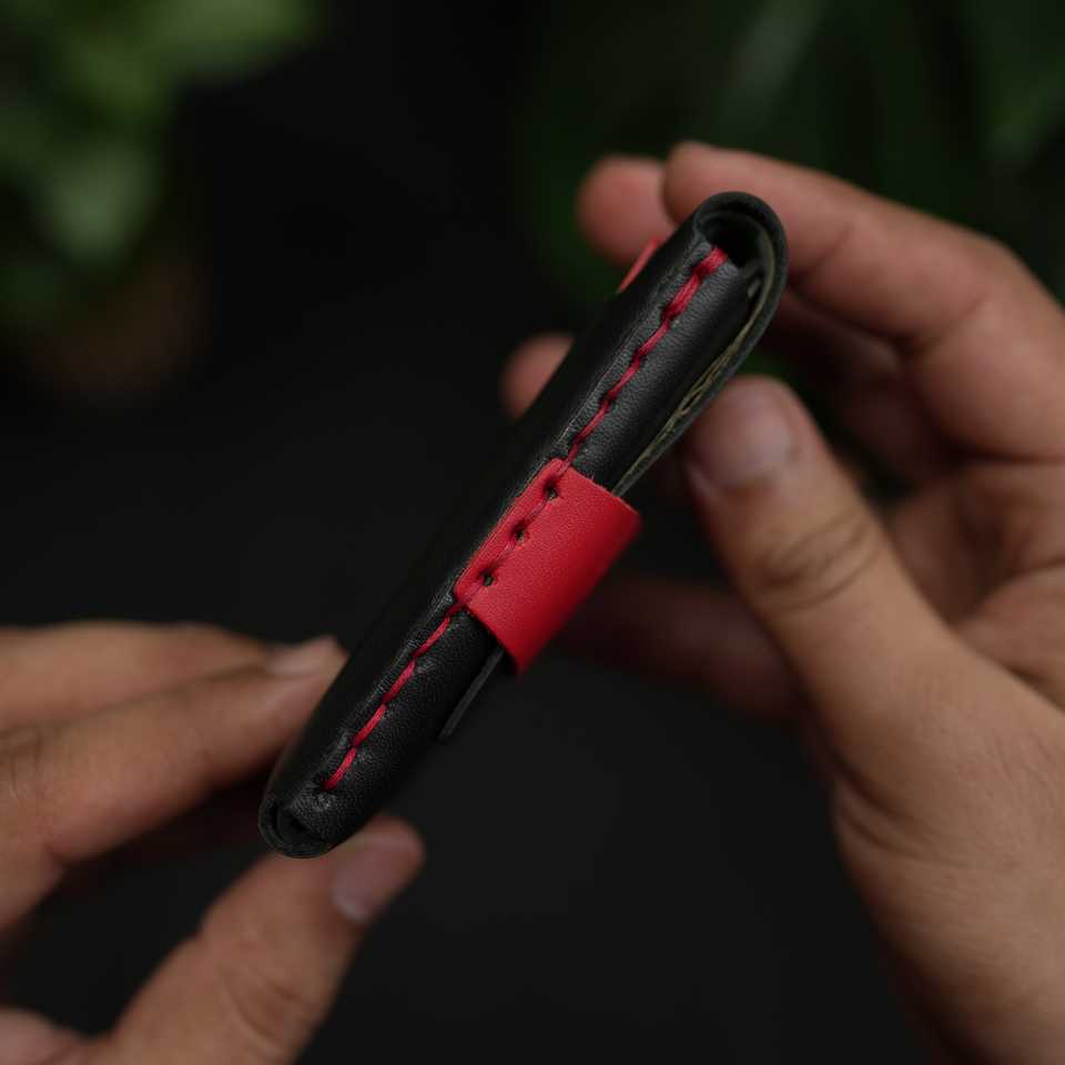 งานฝีมือหนัง WF หมายเลข กระเป๋าใส่บัตรอเนกประสงค์ 101 สีดำแดง ใช้งานได้ทั้งแบบยาวและแบบสั้น เปิด-ปิดง่าย ผลิตจากหนังวัวฟอกฝาดแบบธรรมชาติ