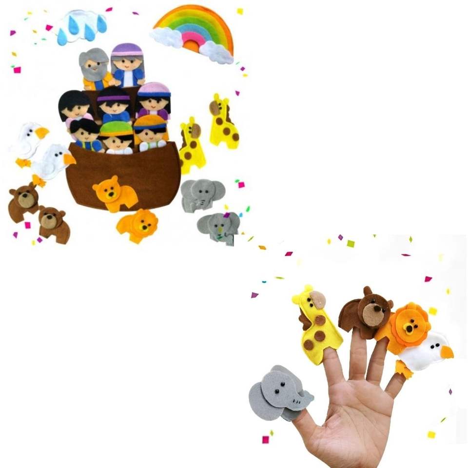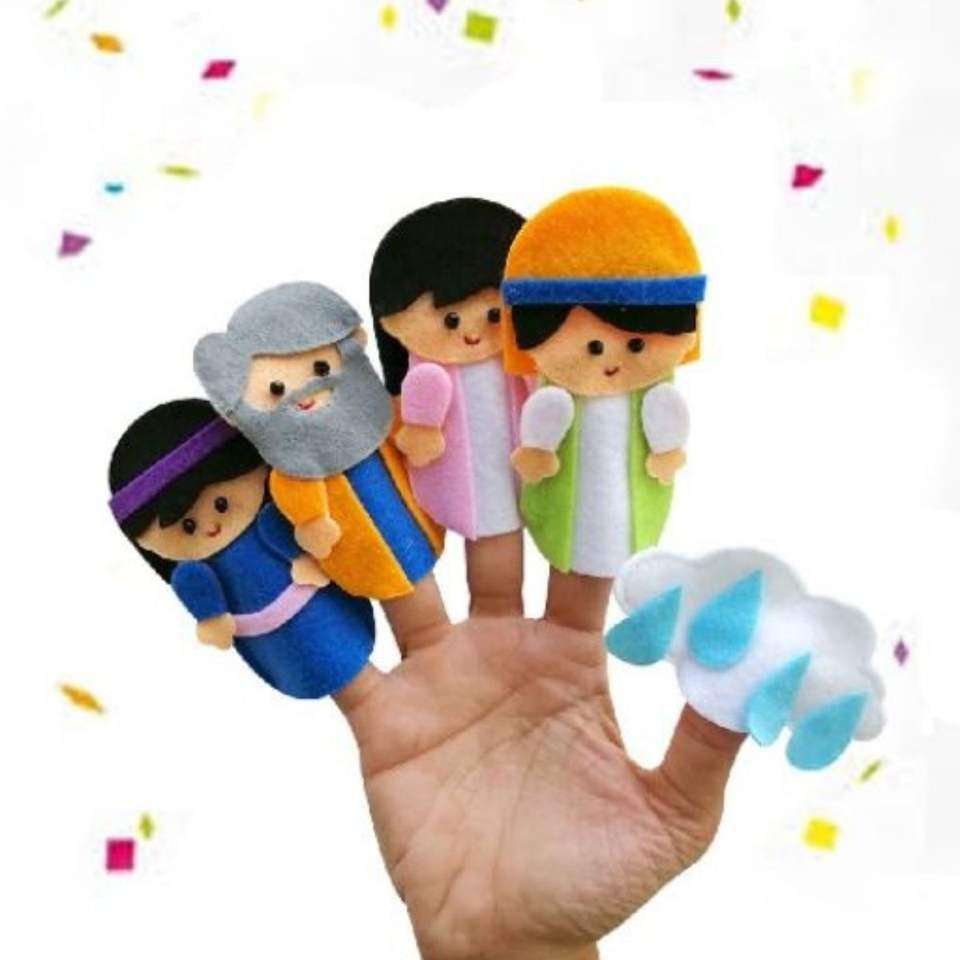 ชุดหุ่นนิ้วครอบครัวโนอาห์ ผ้าเนื้อนุ่ม ทนทาน พร้อมตัวละครโนอาห์ ภรรยา และลูกชาย เหมาะสำหรับเด็กอายุ 2-6 ปี ใช้ในโรงเรียนวันอาทิตย์หรือที่บ้าน