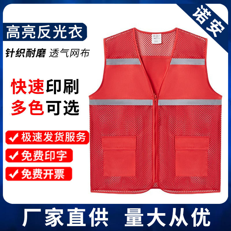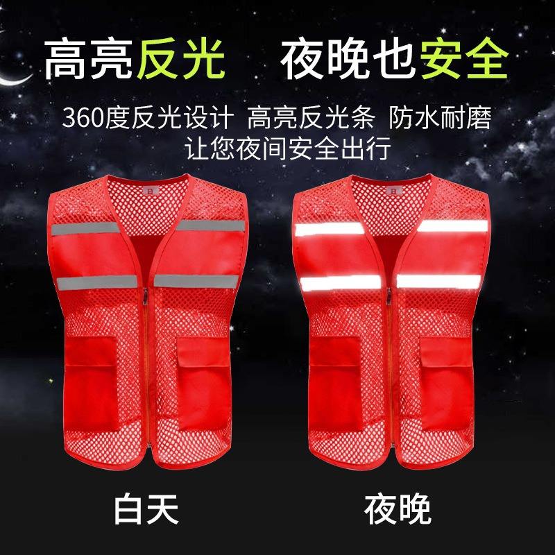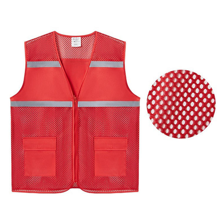 เสื้อกั๊กนิรภัยโนอันตาข่ายสะท้อนแสงสีแดง ชุดทำงานที่มองเห็นได้ชัดเจนสำหรับใช้งานกลางแจ้ง