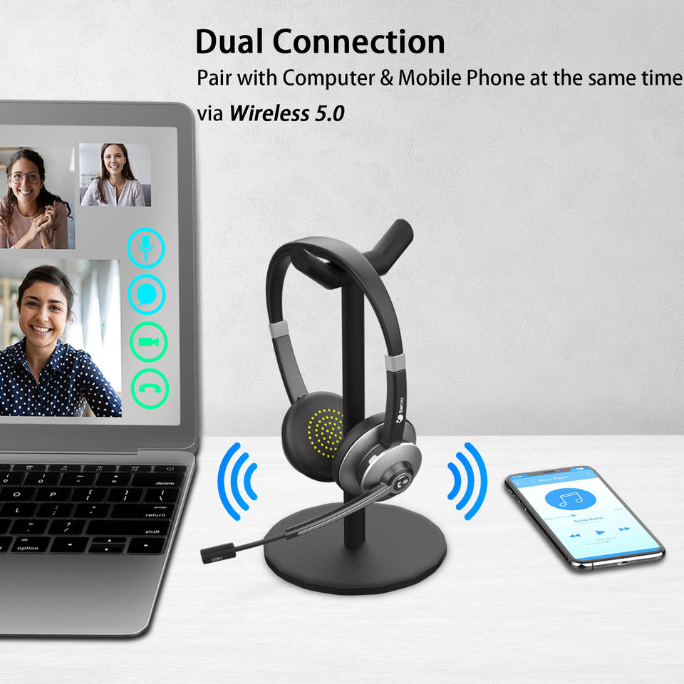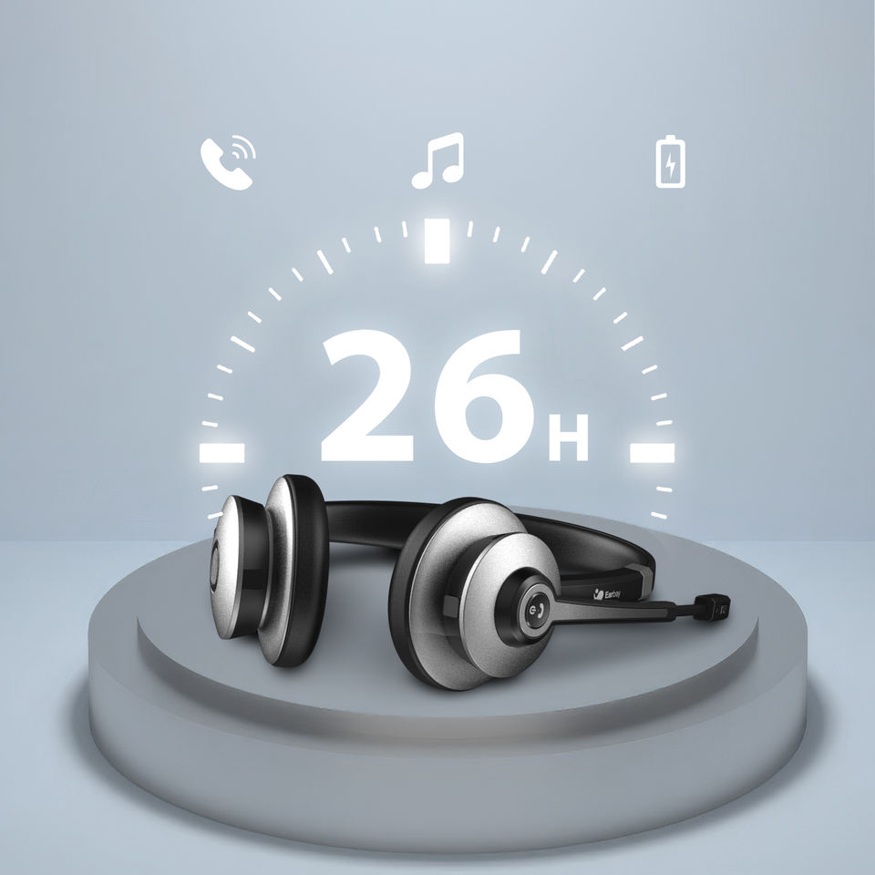 ชุดหูฟังไร้สายตัดเสียงรบกวนพร้อมไมโครโฟน หูฟังสเตอริโอสำหรับพีซีพร้อมปุ่มปิดเสียงและสนทนาได้นาน 26 ชั่วโมง สำหรับคอมพิวเตอร์ในสำนักงาน สมาร์ทโฟน และการประชุมผ่านซูม