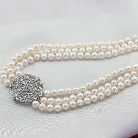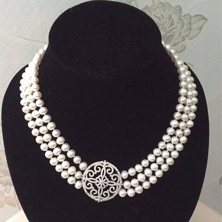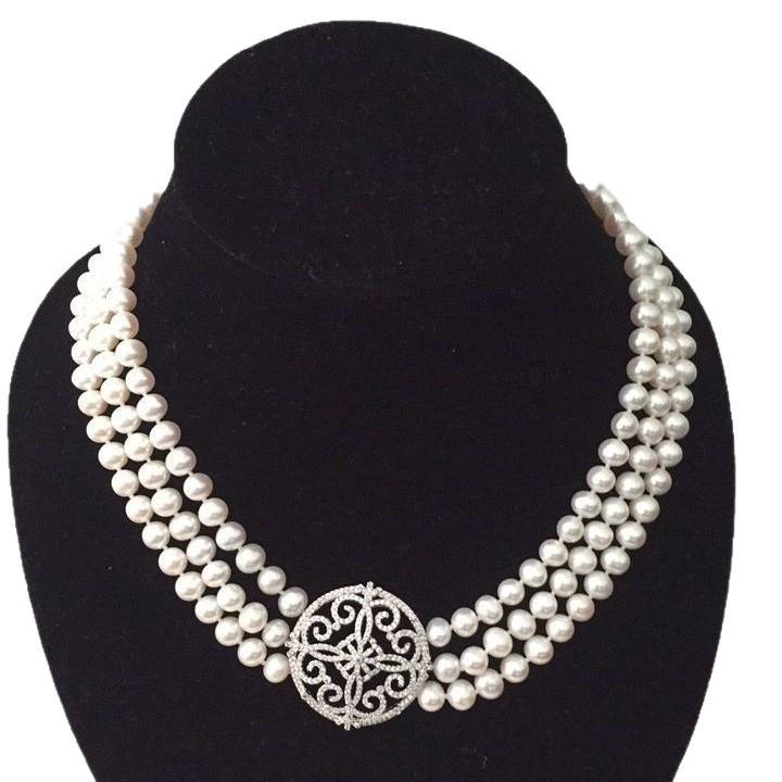 สร้อยคอมุกน้ำจืดไม่ใช่สารกัมมันตภาพรังสี ขนาด 5.5-6 มม. หลายแถว ทรงเกือบกลม ไร้ตำหนิ สามแถว แบบคล้องไหปลาร้า