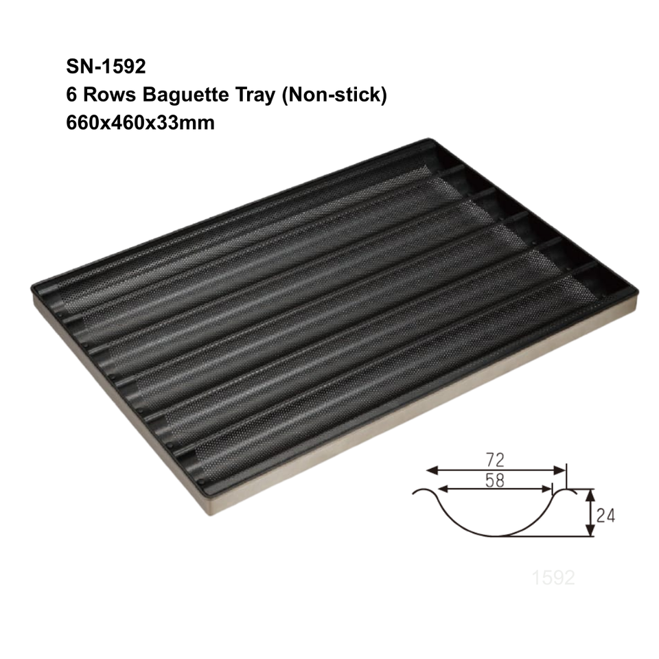 ถาดอบขนมปังบาแกตต์ 6 แถว แบบไม่ติดกระทะ ทำจากอลูมิเนียมอัลลอยด์เกรดเชิงพาณิชย์ สำหรับอบขนมปังฝรั่งเศส 6 ก้อน แบบมีรูระบายอากาศ ใช้กับเตาอบได้ ขนาด 660x460 มม.