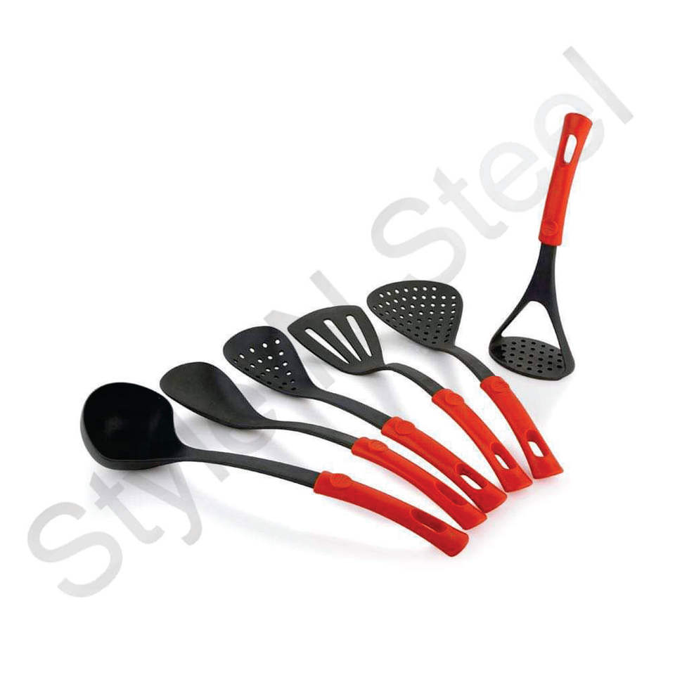ชุดเครื่องครัว6ชิ้นพร้อมที่จับสีแดงทนความร้อนกันไม่ติดช้อนช้อนตักไม้พายไนลอน