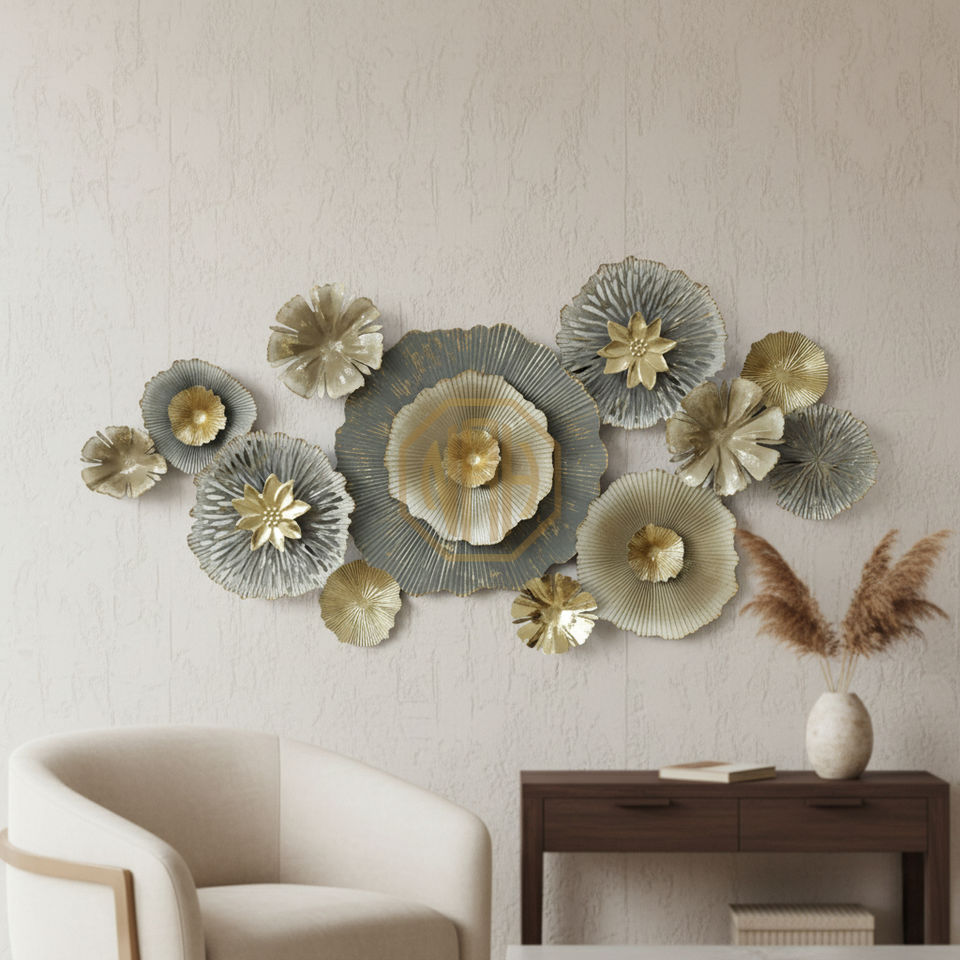 งานฝีมือหรูหราจากนูริมส์ อัคบาร์ งานเหล็กประดับผนังลายดอกไม้สีทอง งานเหล็กตกแต่งบ้าน
