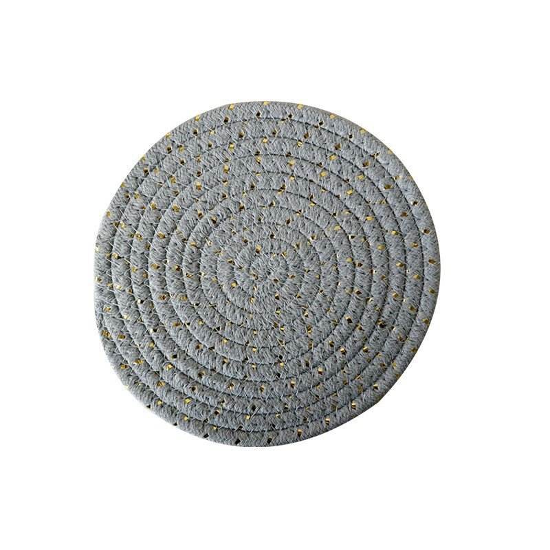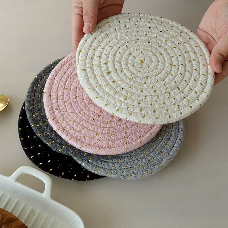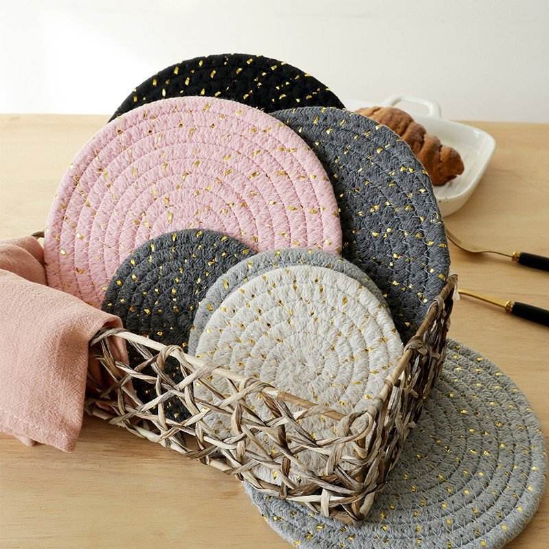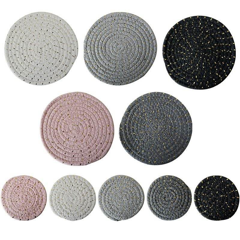 แผ่นรองจานผ้าฝ้ายนอร์ดิกทรงกลม สีพื้น พร้อมด้ายสีทอง ป้องกันความร้อน ใช้ในครัว