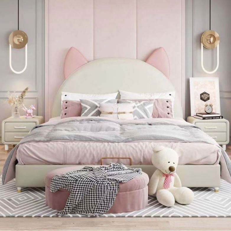 เตียงนอนสไตล์นอร์ดิกโมเดิร์นสำหรับเด็กผู้หญิง ดีไซน์หูแมวสุดสร้างสรรค์ ผลิตจากผ้าฝ้าย ขนาดใหญ่ โครงไม้ แข็งแรง นอนสบาย ยี่ห้อ WL ผลิตในจีน