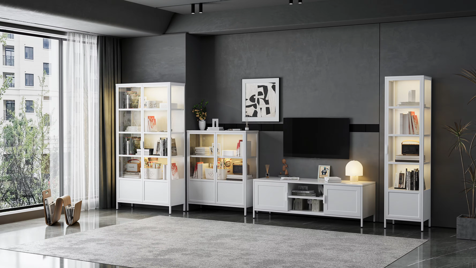 ตู้โชว์เหล็กสไตล์นอร์ดิก ตู้วางทีวีเหล็กสไตล์นอร์ดิก ตู้เก็บของโลหะสำหรับห้องนั่งเล่น พร้อมบานกระจก
