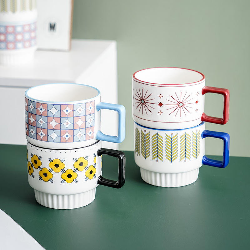 แก้วเซรามิกสไตล์นอร์ดิกพร้อมหูจับ ดีไซน์แบบซ้อนเก็บได้ สำหรับกาแฟ ชา อาหารเช้า ใช้ในบ้าน