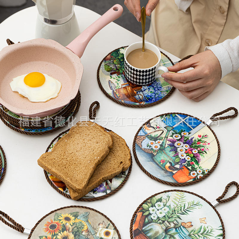 แผ่นรองจานเซรามิกสไตล์นอร์ดิก ลายดอกไม้ทรงกลม แผ่นรองกันความร้อนสำหรับป้องกันภาชนะบนโต๊ะอาหาร