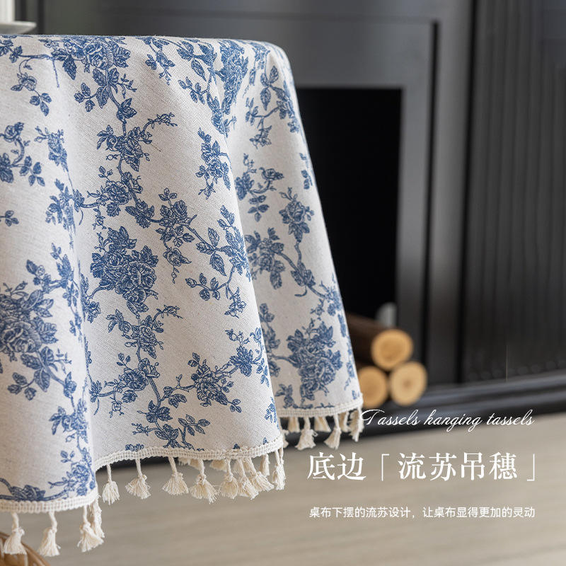 ผ้าปูโต๊ะทรงกลมสไตล์นอร์ดิก ผ้าฝ้ายลินิน พิมพ์ลายดอกไม้สีฟ้า พร้อมพู่ห้อย สำหรับตกแต่งโต๊ะอาหารที่บ้าน