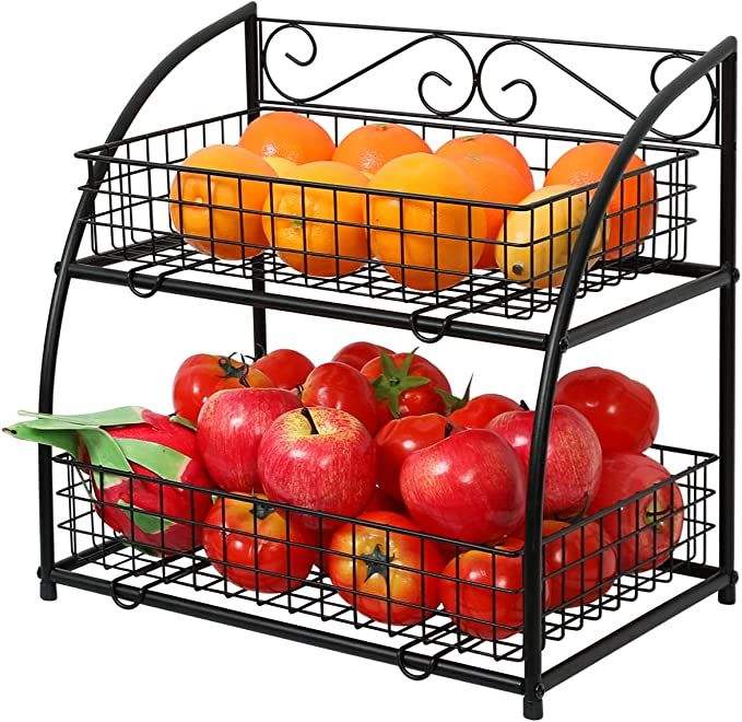 ตะกร้าผลไม้สองชั้นแบบถอดได้ สไตล์นอร์ดิก ทำจากเหล็กกลวง สำหรับวางบนเคาน์เตอร์ | ของตกแต่งกลางโต๊ะสไตล์มินิมอลสีดำเมทัลลิก