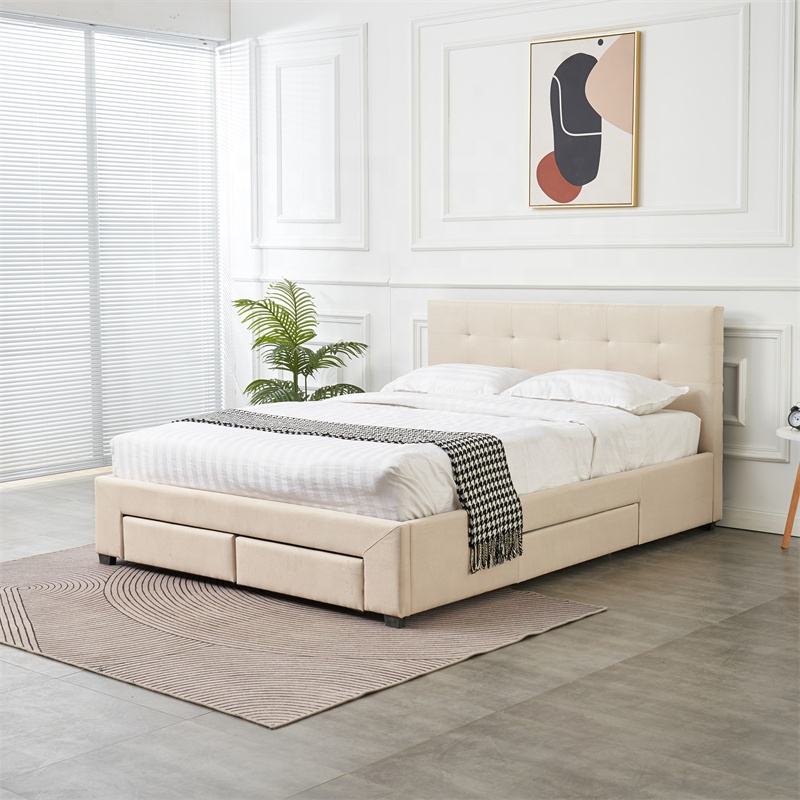 เตียงหุ้มเบาะสไตล์นอร์ดิก ขนาดควีนไซส์คู่/คิงไซส์ หัวเตียงนุ่มประดับกระดุม โครงไม้ พร้อมที่เก็บของ 4 ช่อง