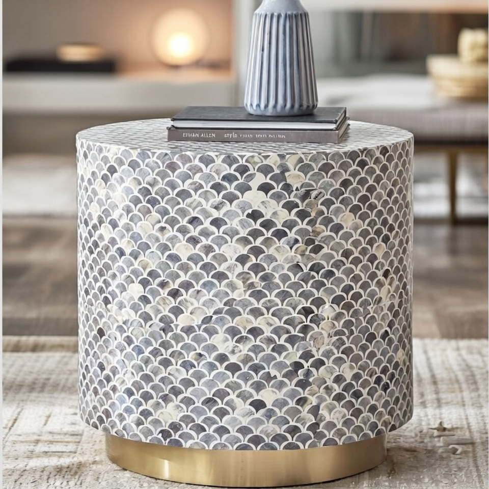 โต๊ะกาแฟทรงกลมสไตล์นอร์ดิกหรูหรา ประดับด้วยกระดูกและมุกเปลือกหอยลายดอกไม้ โต๊ะกลางตกแต่งบ้านสไตล์โมเดิร์น
