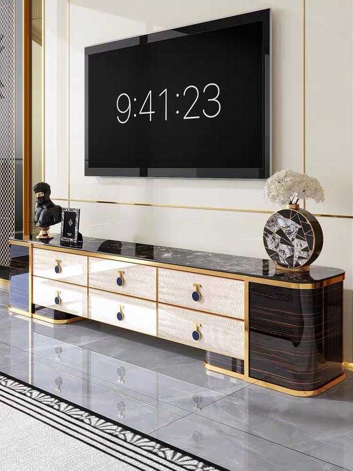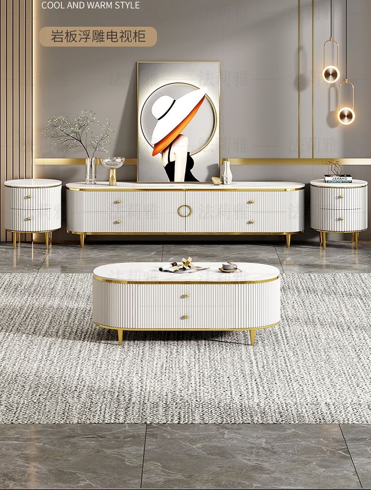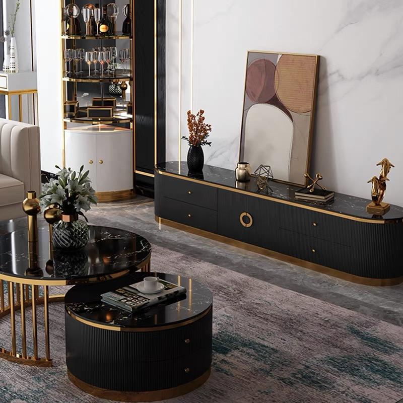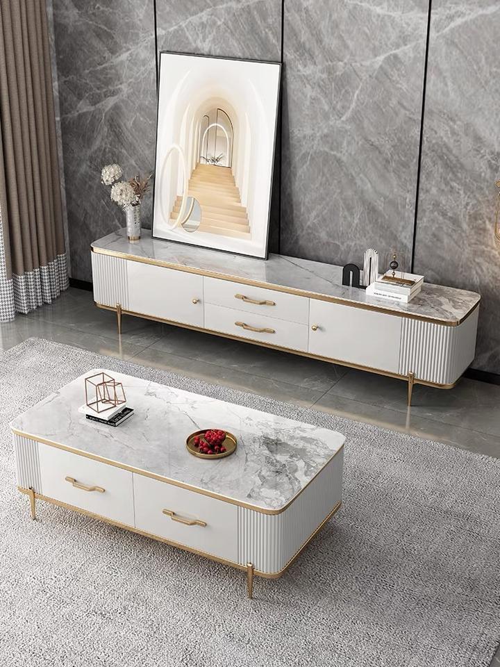 สไตล์นอร์ดิกที่ทันสมัยการออกแบบล่าสุดแสงหรูหราหินอ่อนโหมดด้านบนที่มีขาทองโต๊ะกาแฟและตู้ทีวีหน่วยเฟอร์นิเจอร์