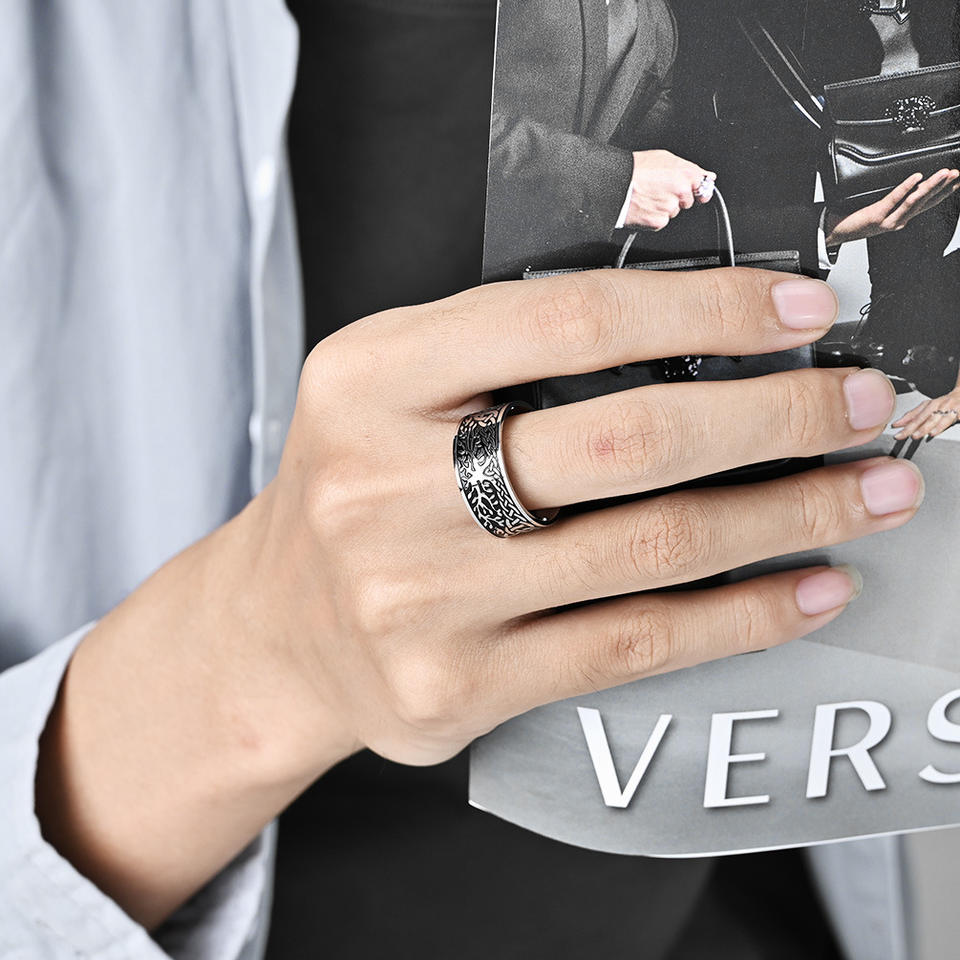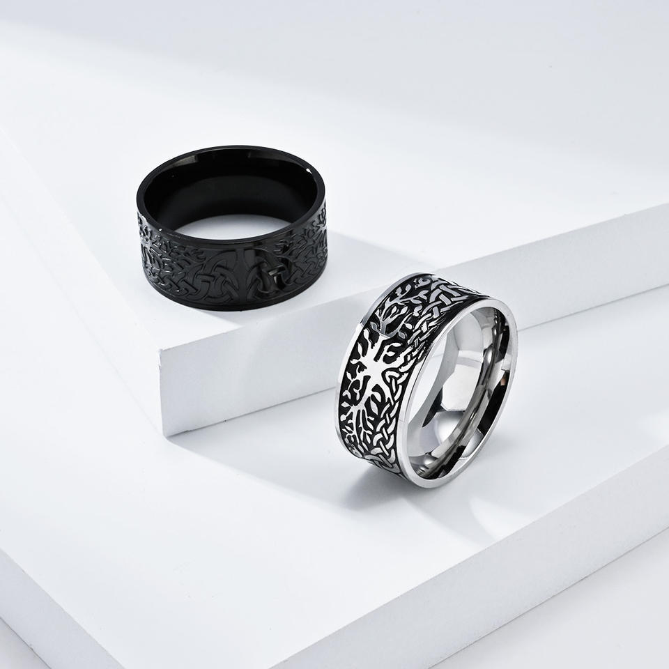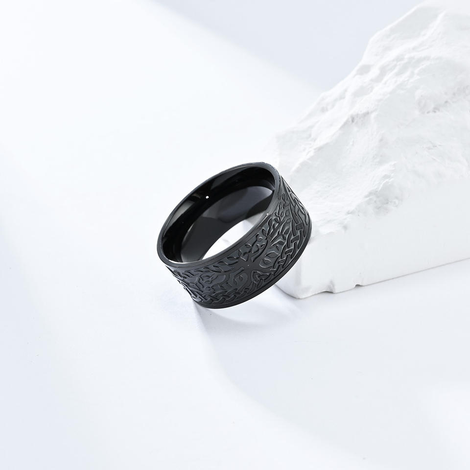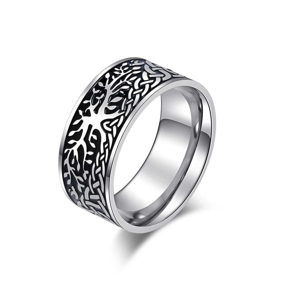 แหวนเหล็กไทเทเนียมต้นไม้แห่งชีวิตสไตล์นอร์ดิกสำหรับผู้ชาย สีดำ ไซส์ 8 ของขวัญเครื่องประดับ