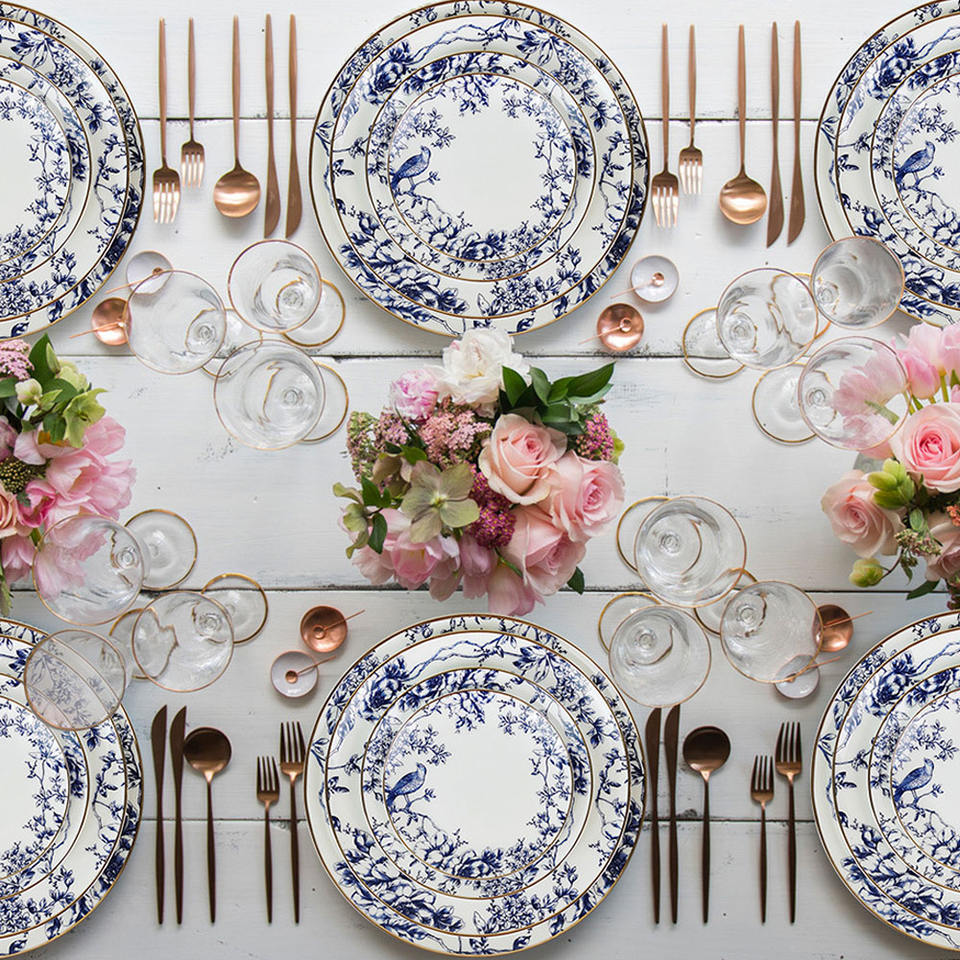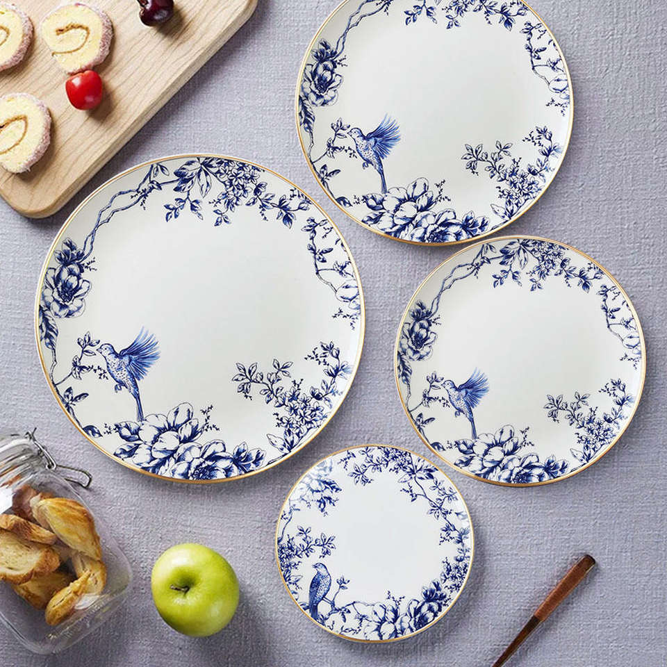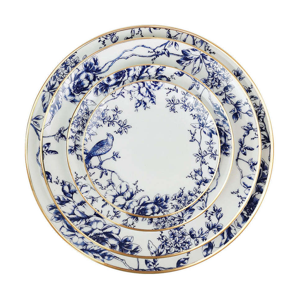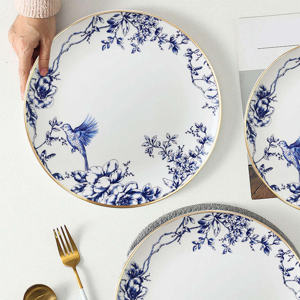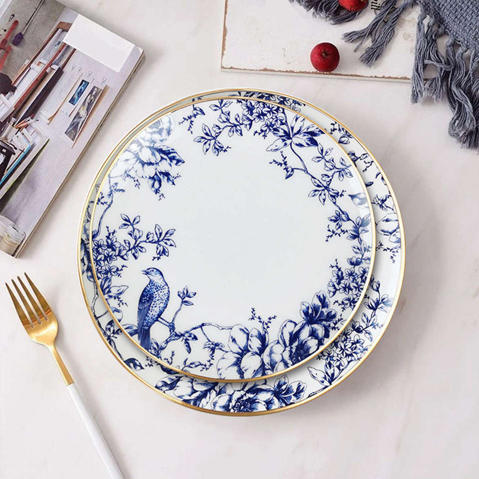 ชุดจานชามเซรามิคลายดอกไม้นอร์ดิกวินเทจสีขาวน้ำเงินขอบทองสำหรับตกแต่งงานแต่งงาน ชุดอาหารสไตล์นอร์ดิก