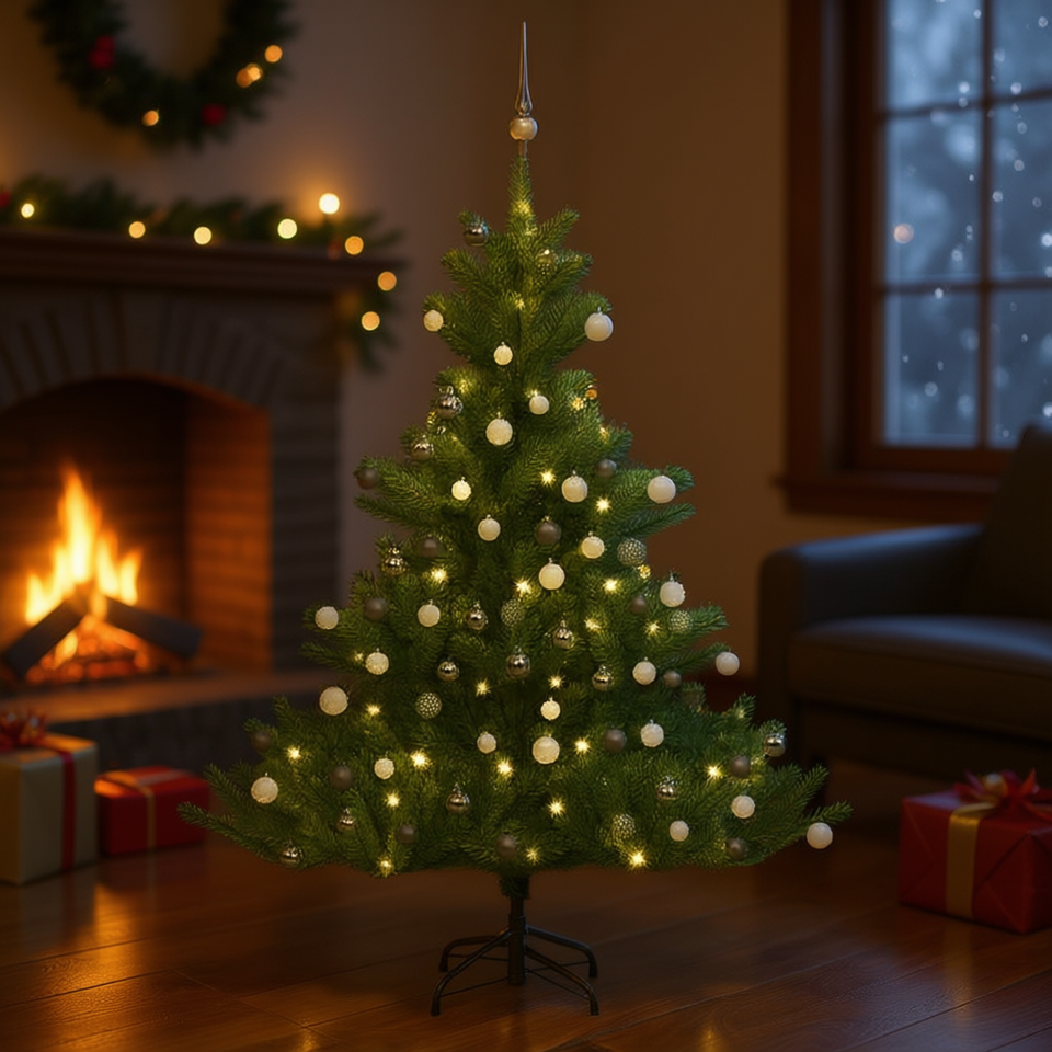 ต้นคริสต์มาสประดิษฐ์จากไม้เฟอร์นอร์ดแมนน์ ขนาด 59.1 นิ้ว พร้อมไฟ LED สีขาวอบอุ่น ฐานตั้งพลาสติกสำหรับตกแต่งภายในอาคาร