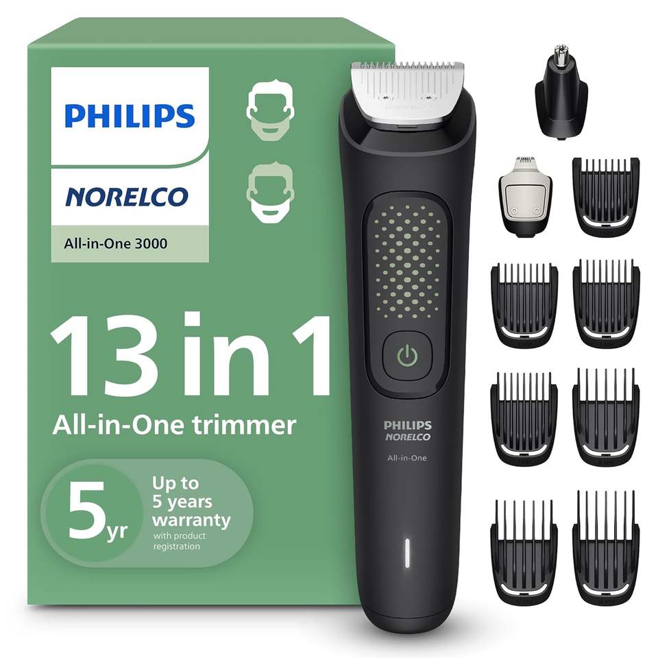 เครื่องโกนหนวด Norelco All-in-One 3000 Series สำหรับผู้ชาย ใบมีดสแตนเลส ปรับความยาวได้ 8 ระดับ ใช้งานได้นาน 61-90 นาที ใช้แบตเตอรี่ AAA ผลิตในเยอรมนี