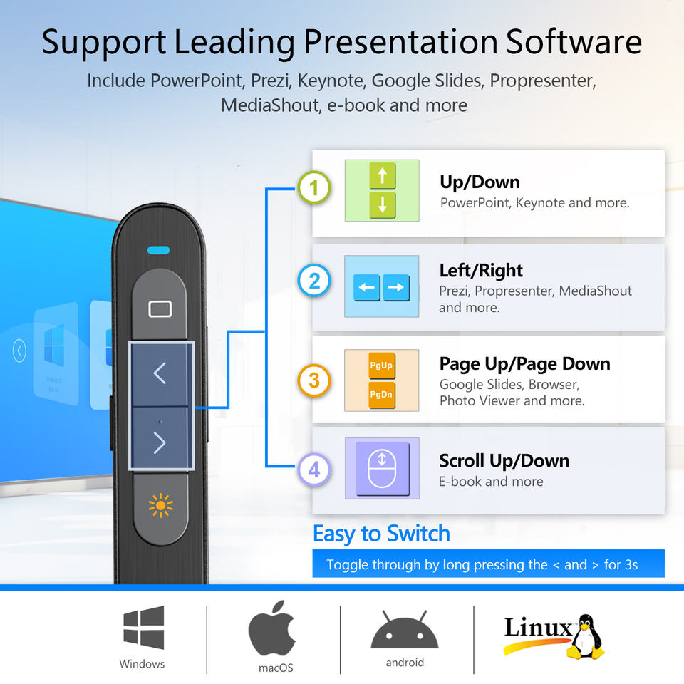 Page up/down, Full/Black screen, Choose/Open PowerPoint Hyperlink, Volume up/down