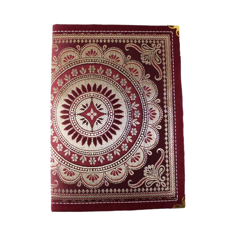 ปกสมุดโน้ตเล่มที่มีระดับของการตกแต่งอย่างหรูหราผ้าทอกระสวยที่ทำจากผ้าไหมสีทองและสีเงิน