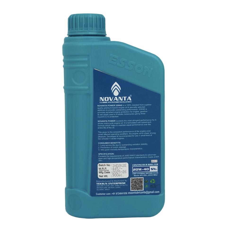 น้ำมันเครื่องสังเคราะห์แท้ โนวันต้า พาวเวอร์ 20W40 สำหรับรถจักรยานยนต์ 4 จังหวะ เช่น ฮอนด้า ยูนิคอร์น API SN 20w40 ขนาด 900 มล.