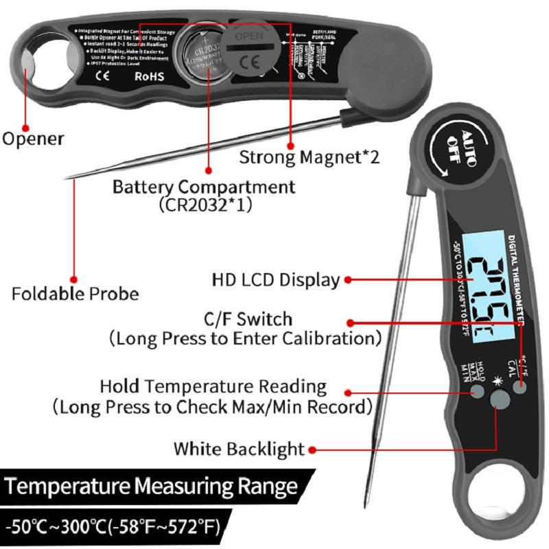 เครื่องวัดอุณหภูมิเนื้อแบบดิจิตอล Novax Plastic Griller อ่านค่าได้ทันที กันน้ำ หน้าจอ LCD แสดงผลพร้อมไฟพื้นหลัง ใช้พลังงานจากแบตเตอรี่ เกรดสำหรับอาหาร ช่วงอุณหภูมิ -50 องศาเซลเซียส ถึง 300 องศาเซลเซียส